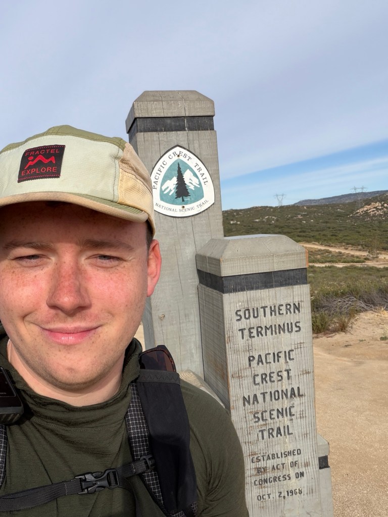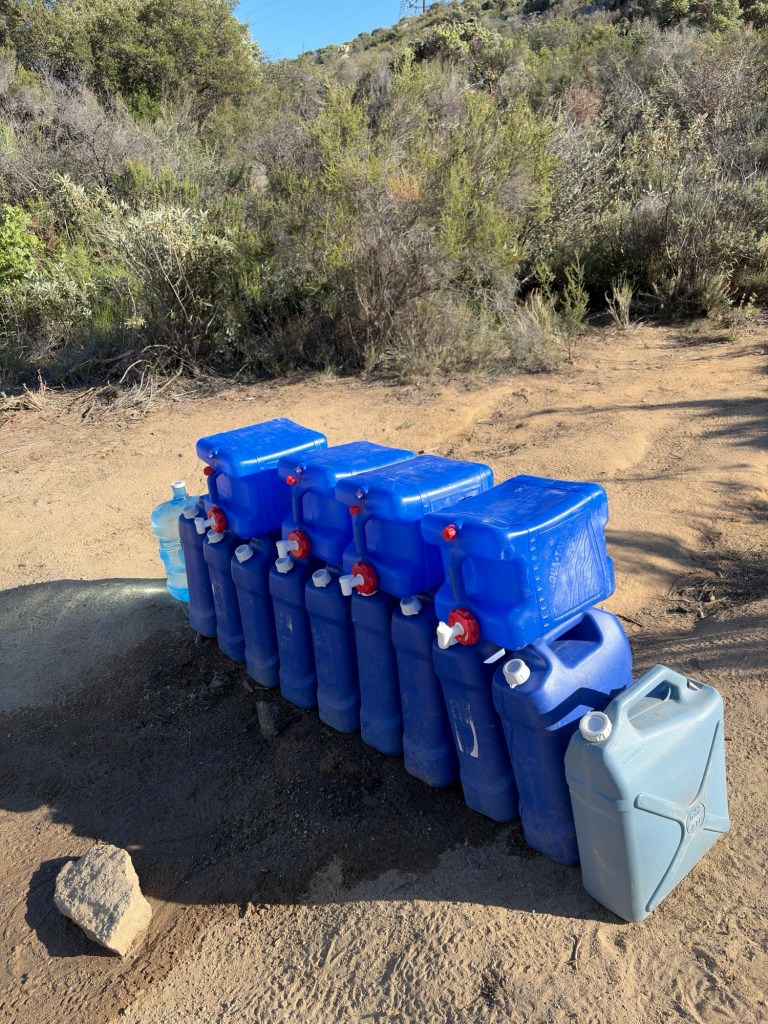 The morning walking was largely uneventful, with quite limited elevation and a well cleared path, but it soon became clear that the biggest struggle would be water. The typical advice is to carry 1L of water for every 4 miles on trail but to increase to 1L per 3 miles in the desert heat. With a 14 mile carry to the first water in this stretch, that meant carrying 5L of water from the terminus, weighing 11lbs (over 25% of my total carried weight). Due to also carrying 5 days worth of food out of Campo, it meant my pack was already over 40lbs, the heaviest it will be until I reach Kennedy Meadows almost 700 miles later. Luckily the weight felt okay and I made pretty consistent progress to the water cache at mile 14.