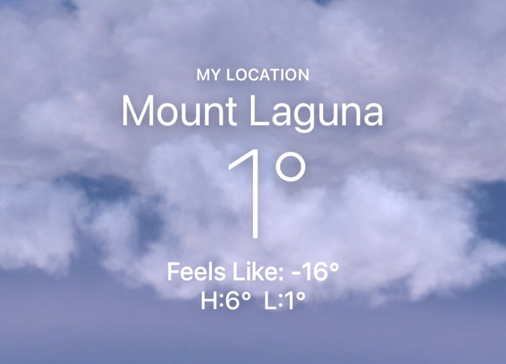 The wind is expected to die down by the morning and while temperatures won’t increase too much, it will be possible to hike and the more we descend down the mountain, the warmer it will get. The current plan is to walk an 18 mile day tomorrow, where I will be closer to 4500ft elevation and should enjoy a much better evening. With two full days, I should be close to Scissors Crossing where I will get my first hitch into the town of Julian, with a current plan to take the afternoon off on Wednesday and spend the night. Fingers crossed conditions will allow.